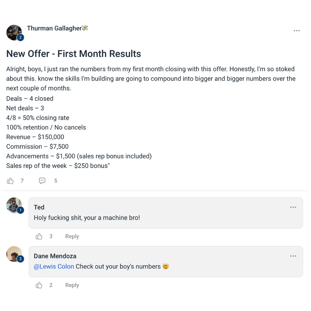 A focused, low-noise community to ask questions, find accountability, and connect with other serious closers. No spam. No drama. Execution only.